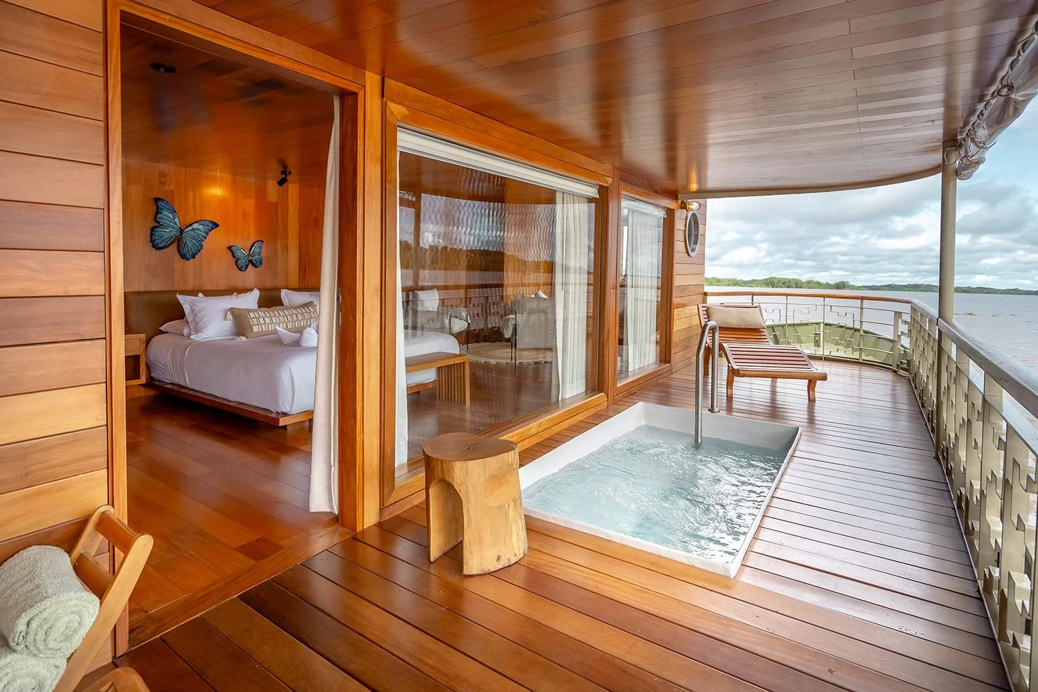 Not only the smallest of her sibling riverboats, Delfin I is also the most exclusive luxury riverboat cruising the Peruvian Amazon today. Perfect for an intimate rainforest experience, she consists of only 4 luxury suites with private panoramic terraces, and 2 of these (the Master Suites) boast a jacuzzi for the ultimate treat. Floor-to-ceiling windows allow close up encounters of the surrounding nature, and on the top deck, guests will find a lounge area, bar and library which are the perfect places to relax and reflect during this jungle adventure.
